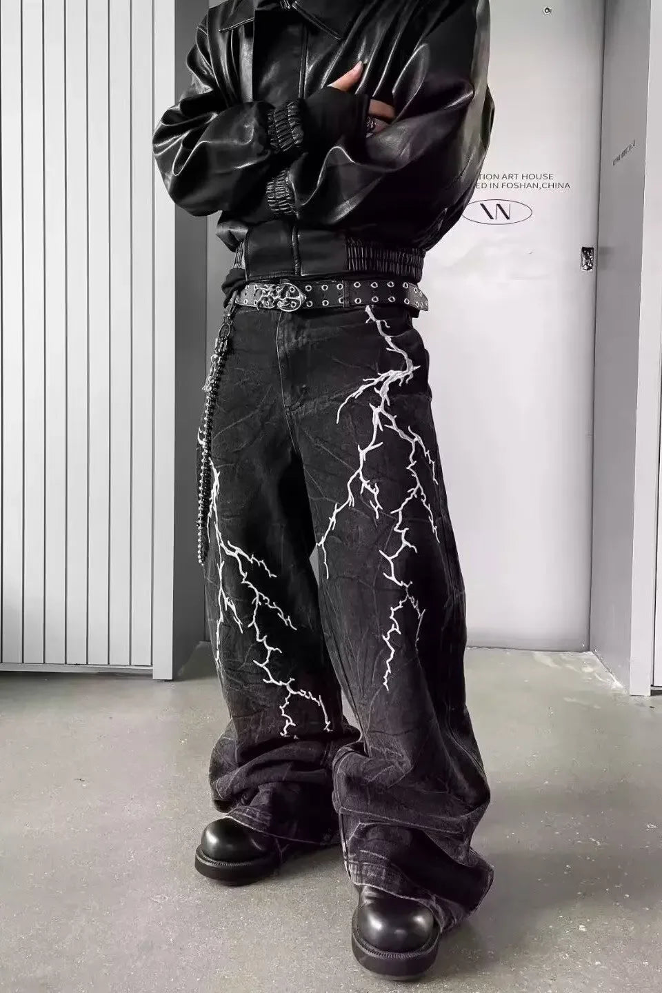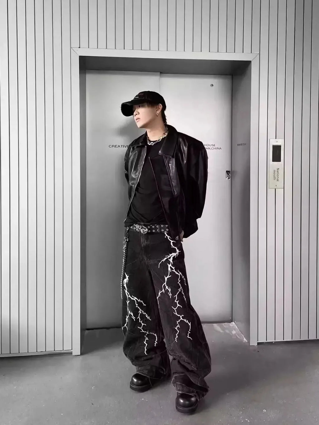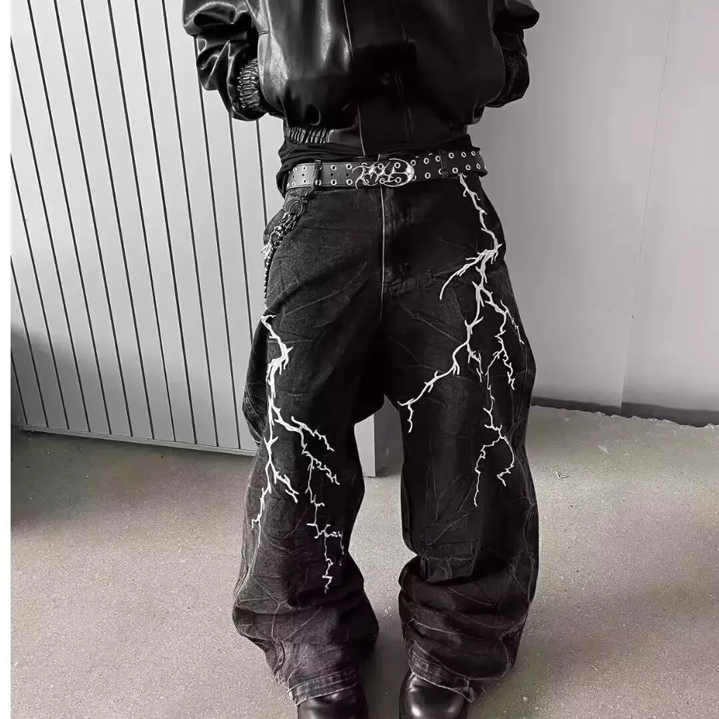 Com um ajuste solto e perna larga, ele oferece conforto e um visual marcante, perfeito para quem busca autenticidade e exclusividade. O bordado relâmpago adiciona um toque único, transformando cada passo em uma afirmação de confiança.
